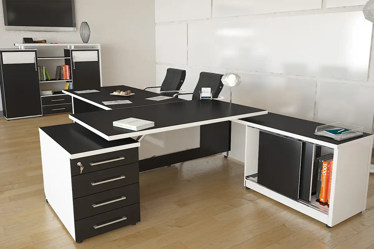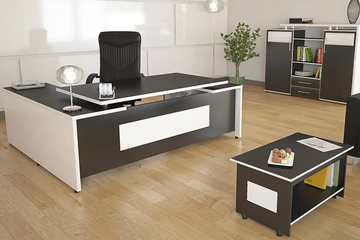 امکانات جانبی دارای کشو و کمدهای جانبی با طراحی ارگونومیک برای نگهداری پوشه‌ها، وسایل و لپ‌تاپ